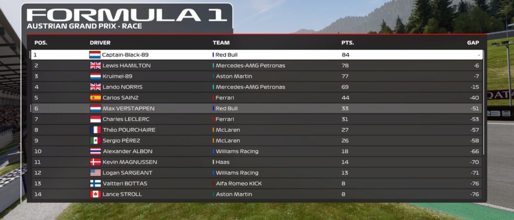 The Captain extended his lead in the championship to six points over Hamilton, while Kruimel narrowed the gap to just seven points behind the reigning champion. The Austrian Grand Prix provided fans with an unforgettable Dutch duel and set the stage for more thrilling battles in Formula 1 Co-Op Season 2.