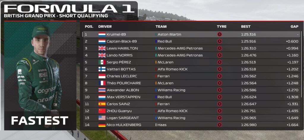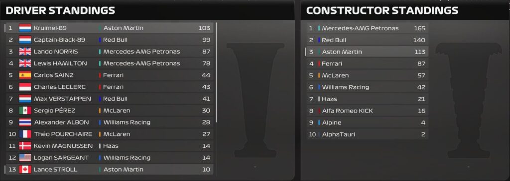 The Silverstone results shuffled the championship standings. Kruimel’s victory propelled him to the top of the driver’s standings with 103 points. The Captain, now in second with 99 points, faced a slight setback. Norris surpassed Hamilton for third place with 87 points, while Hamilton slipped to fourth with 78 points.