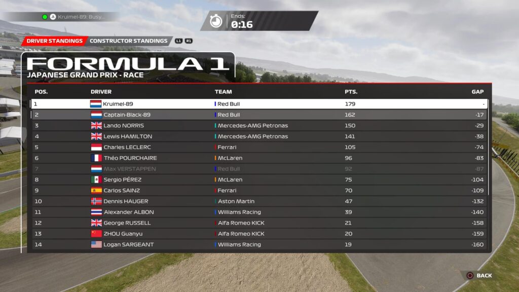In the championship standings, Kruimel strengthened his position at the top with 179 points, while The Captain, with 162 points, faced a widening gap to the leader. Norris, Hamilton, and others maintained their positions, setting the stage for an intense championship battle.