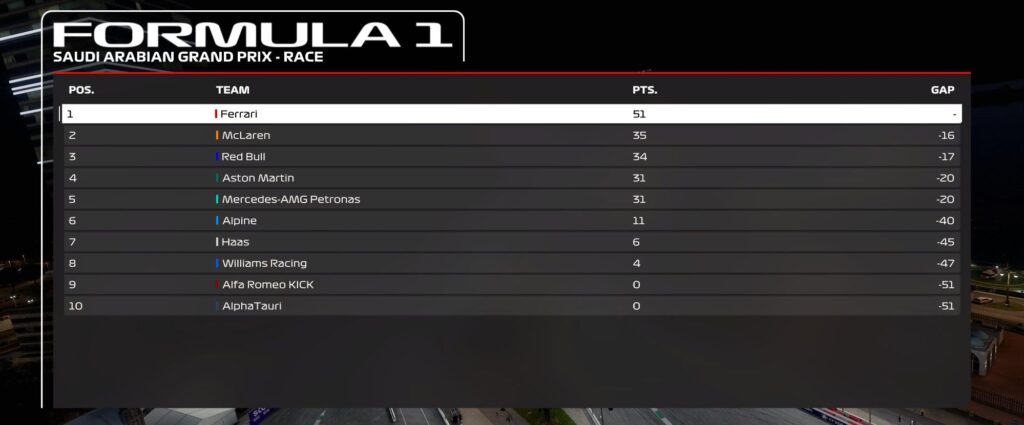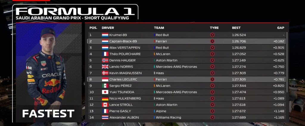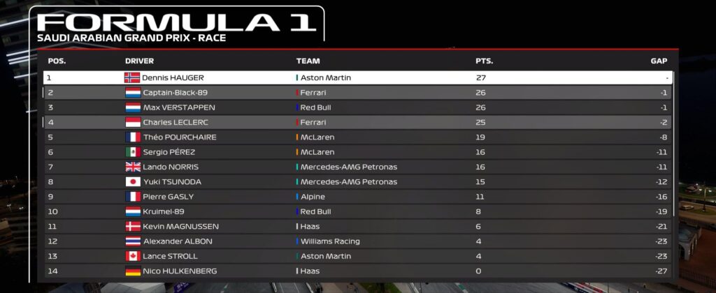 In the championship standings, Hauger’s consistency propelled him to the top with 27 points, followed closely by The Captain and Max Verstappen. Charles LeClerc, with his Jeddah triumph, stands fourth.
