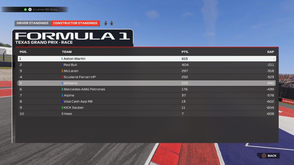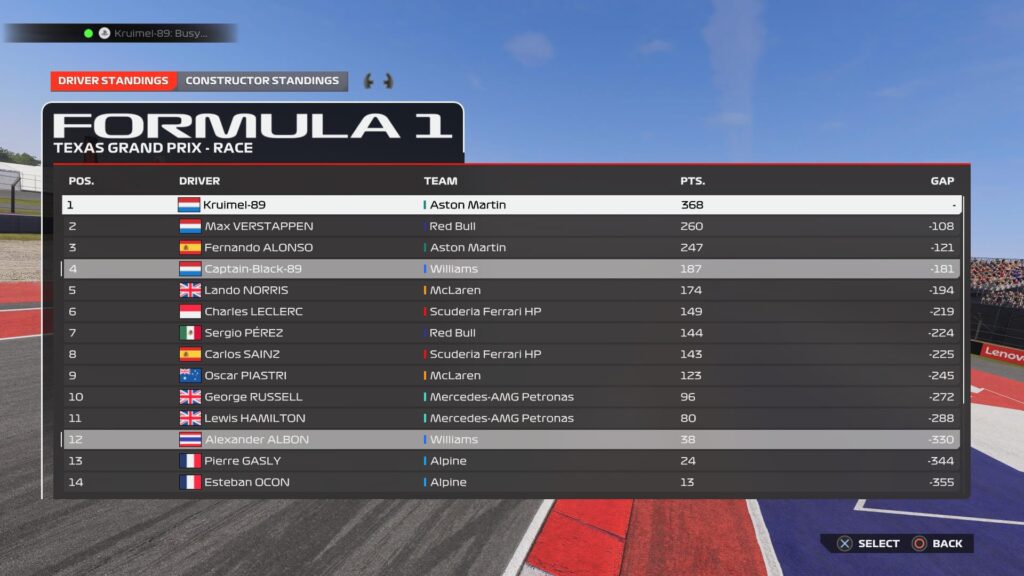 Sprint qualifying kicked off a highly competitive weekend at COTA, with Kruimel setting blistering lap times early on. His primary rival, Max Verstappen, was close but couldn’t topple Kruimel’s pace, securing P2 on the grid. Red Bull’s Sergio Perez followed in P3, while Kruimel’s teammate Fernando Alonso secured a solid P5. The Captain, however, struggled throughout the session, managing only P8 in his Williams.
