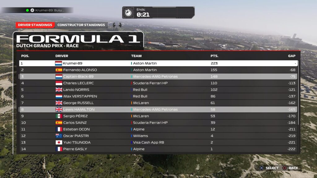 Kruimel, Alonso, and The Captain quickly broke away from the field, forming a tense trio at the front. Verstappen, meanwhile, struggled with pace, falling out of DRS range and into the clutches of Cherles Leclerc. Only on lap 6 is Kruimel able to stretch the gap to his teammate to more than one second. As a result, Alonso loses DRS. The Captain is able to take advantage of this right away and entering lap 7 he passes Alonso for P2 in the race. Alonso tucked in and seemed ready to take back the spot a lap later with DRS.