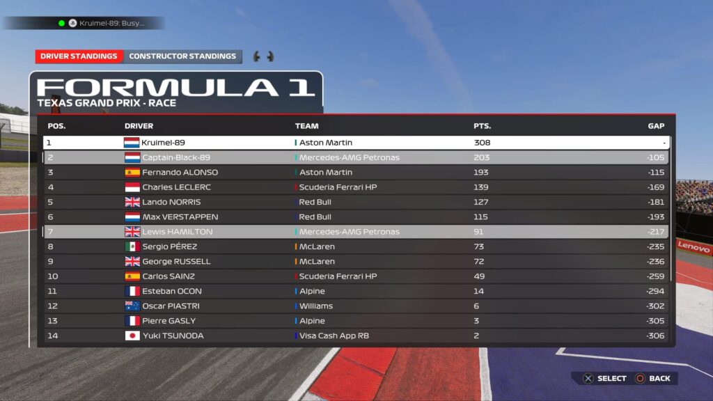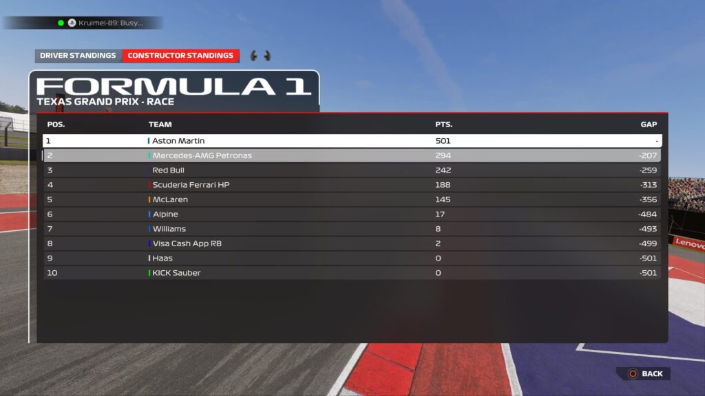 With this result, Kruimel now has an unassailable lead in the drivers’ standings, cementing his dominance over the season. The Captain’s second-place finish, coupled with Alonso’s struggles (finishing sixth), saw him leapfrog Alonso into second place in the standings with a 10-point lead.