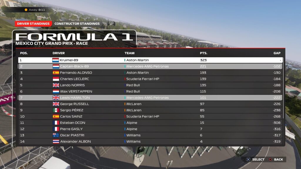 The two leaders quickly built a gap to the rest of the field, while Alonso recovered by overtaking Verstappen on Lap 3. The race appeared to settle into a predictable rhythm until Lap 6, when Kruimel launched an audacious outside move at Turn 4. The Captain held firm, but one lap later, Kruimel used DRS on the main straight to seize the lead. From there, the reigning champion pulled away, leaving The Captain to fend off a charging Alonso.