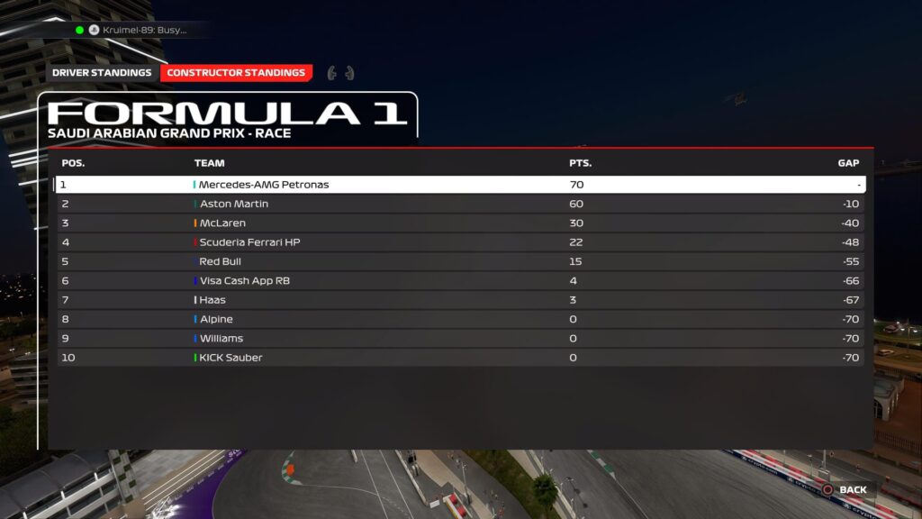 Kruimel took a commanding victory, finishing over ten seconds ahead of Lewis Hamilton, who secured second place after a strong and consistent drive. Fernando Alonso completed the podium, crossing the line in third, just ahead of The Captain, whose recovery drive was admirable but ultimately hindered by car damage. Sergio Perez rounded out the top five, over 24 seconds adrift of the race winner.